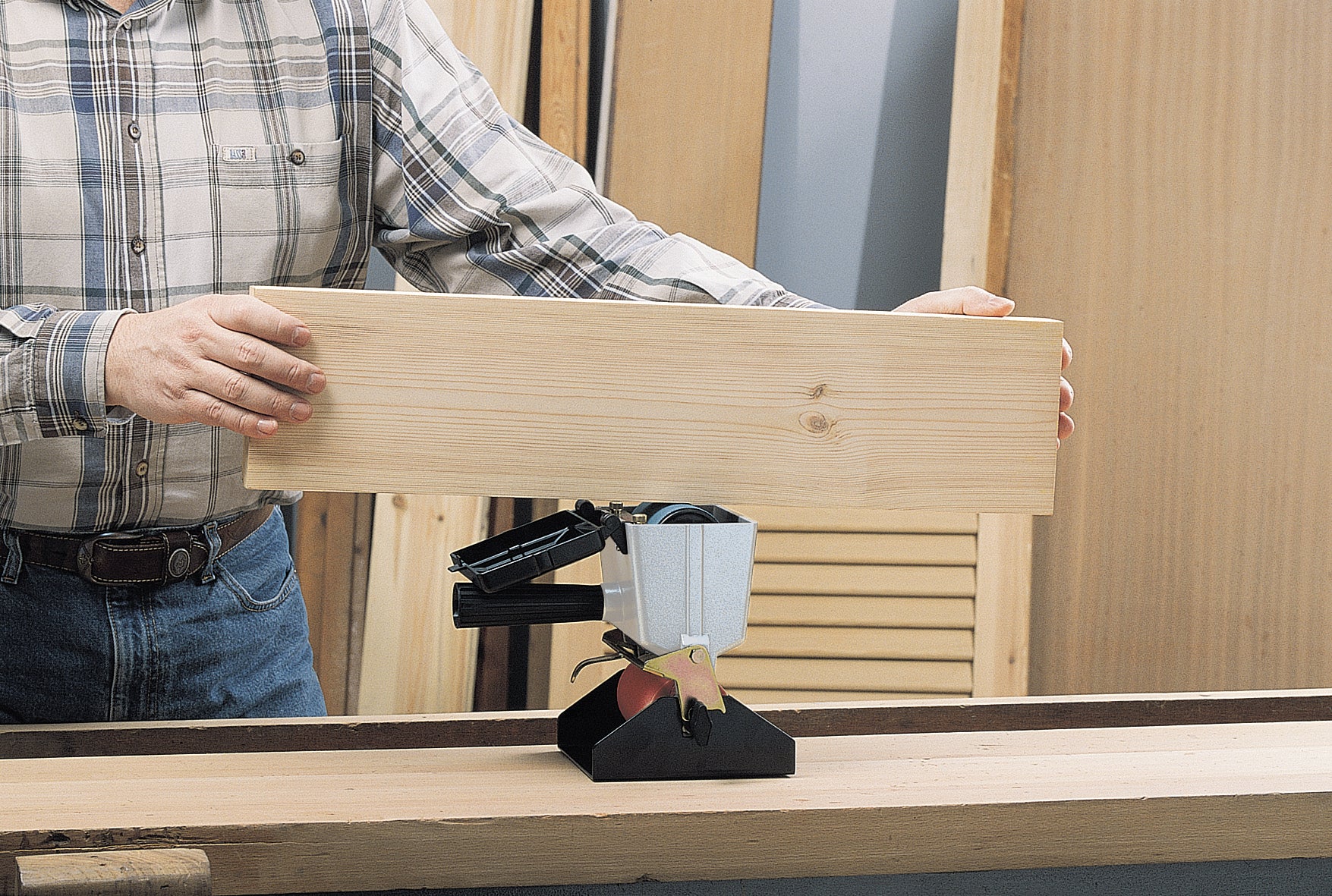 Hand gluer for glueing large surfaces using vinyl glue (White). Lower roller width: 180 mm. Equipped with trigger shut-off device to stop the flow of glue. Also comes with a support where it can be left when not in use, thus keeping the working area and the machine clean. Moreover, is equipped with an upper auxiliary roller for clean glueing of strips.