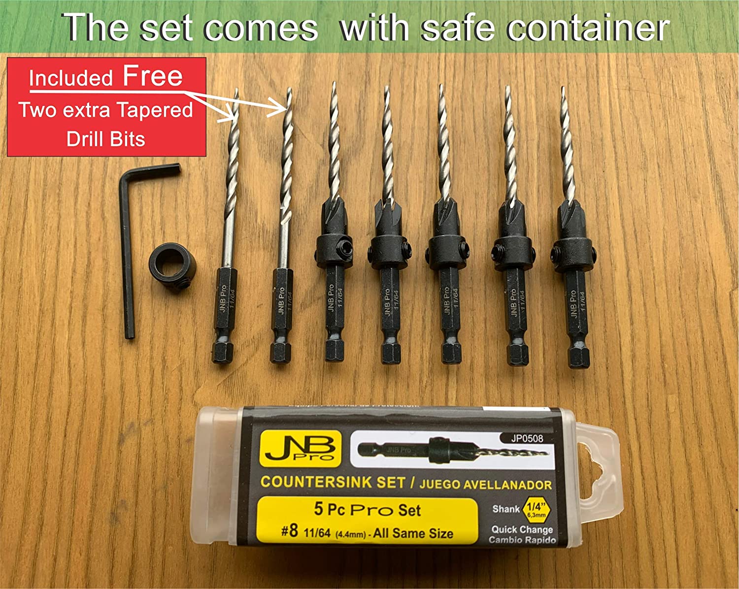 PRECISE COUNTERSINKING FOR WOODWORKING – This set includes 5 #8 adjustable cutters (for up to 3/8" or 10mm screws) designed for precision countersinking. The set also includes 2 extra 11/64 tapered high-speed steel M2 drill bits (6542 grade) for versatility in various projects.  ADJUSTABLE COUNTERSINK BITS FOR WOOD – The adjustable stop collar allows you to easily adjust the counterbore depth. Customize the cutters for different screw sizes to get the perfect fit every time, ideal for cabinet makers, DIYers, and woodworking professionals.  QUICK CHANGE SHANK – Features a 1/4" quick-change shank that’s universally compatible with all 1/4" quick-change chucks, allowing for fast bit changes with no hassle. This feature saves you time and keeps your workflow efficient.  QUALITY MATERIALS & DURABILITY – Made from high-speed steel M2 (6542 grade) and carbon steel #45, this set is engineered for long-lasting performance, offering the same quality as USA-made tools. Built to withstand heavy use, this set ensures reliable results every time.  SAFE AND ORGANIZED STORAGE – Keep your bits protected with the included secure storage case. The case helps you stay organized and ensures your tools remain in top condition for future use. ? Compatible with Medium to High Temperature Edgebanders – Works best from 160 degrees Celsius to 210 degrees Celsius.